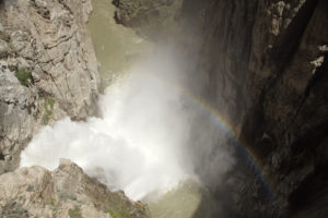 Von der netten Frau in dem Kramladen in Buffalo wussten wir vom Staudamm in Cody, dem Buffalo Bill Dam. Diesem wollten wir unbedingt einen Besuch abstatten – günstig, dass er zufällig genau auf dem Weg in Richtung Yellowstone lag. Es war ein beeindruckendes Bauwerk und da momentan die Schleuse geöffnet war, war das herausschießende Wasser ein gewaltiger Anblick. Die Tatsache, dass momentan gefühlt Windstärke 1000 herrschte, machte das Ganze noch umso intensiver und ich traute mich kaum, mein Handy aus der Hosentasche zu holen – sonst wäre es vermutlich weg gewesen!