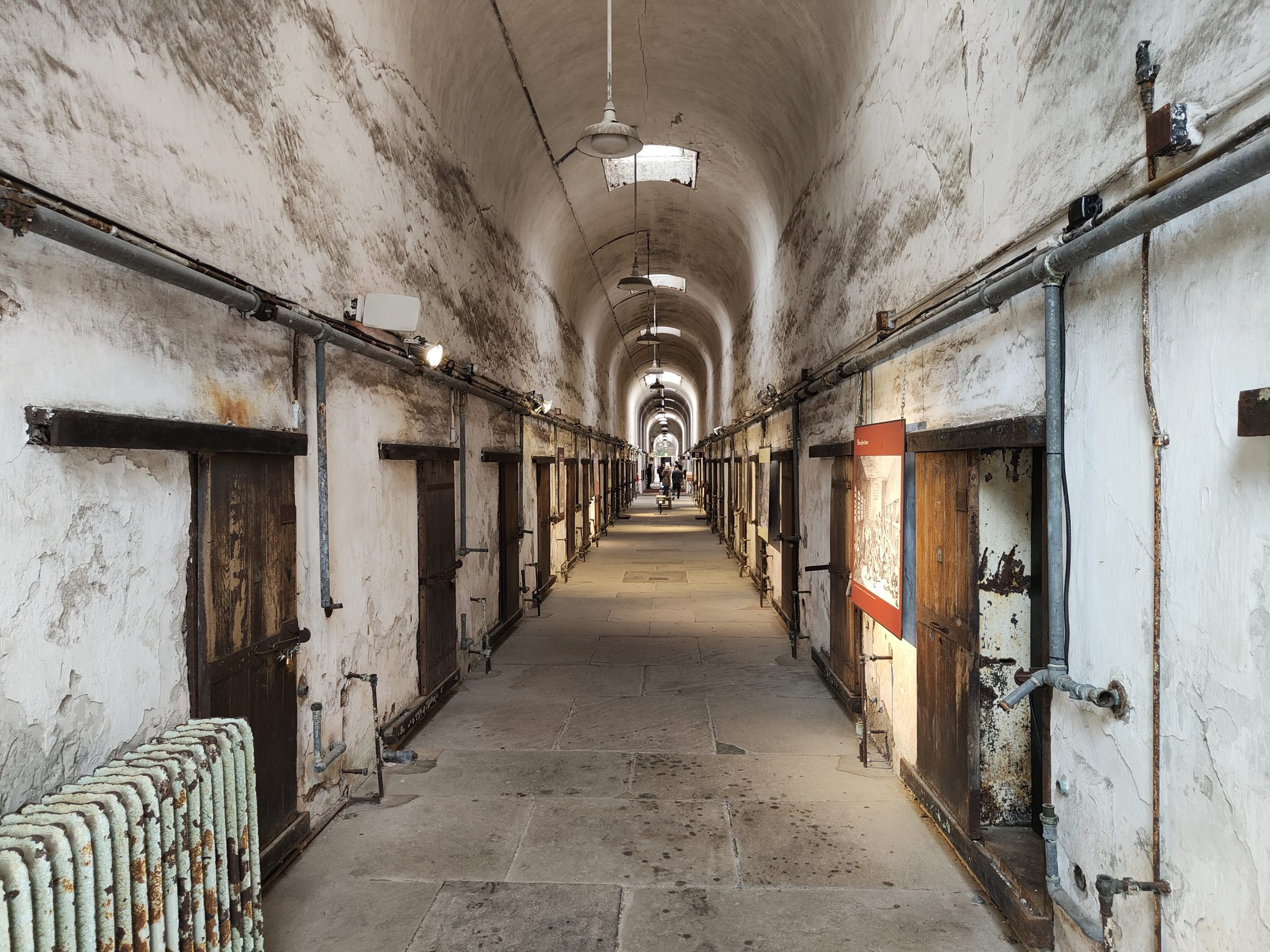 Frisch gestärkt wurde es dann wieder äußerst historisch und wir besuchten das Eastern State Penitentiary, das weltweit erste Gefängnis, das Verbrecher nicht nur einsperren, sondern auch läutern sollte. 1829 in Dienst gestellt und mit einer Vielzahl moderner Errungenschaften ausgestattet (z.B. Toiletten mit Abfluss, die seinerzeit nicht mal das Weiße Haus vorweisen konnte!), war das Gefängnis, äußerlich zur Abschreckung einer Ritterburg nachempfunden, bis 1970 durchgehend in Betrieb.