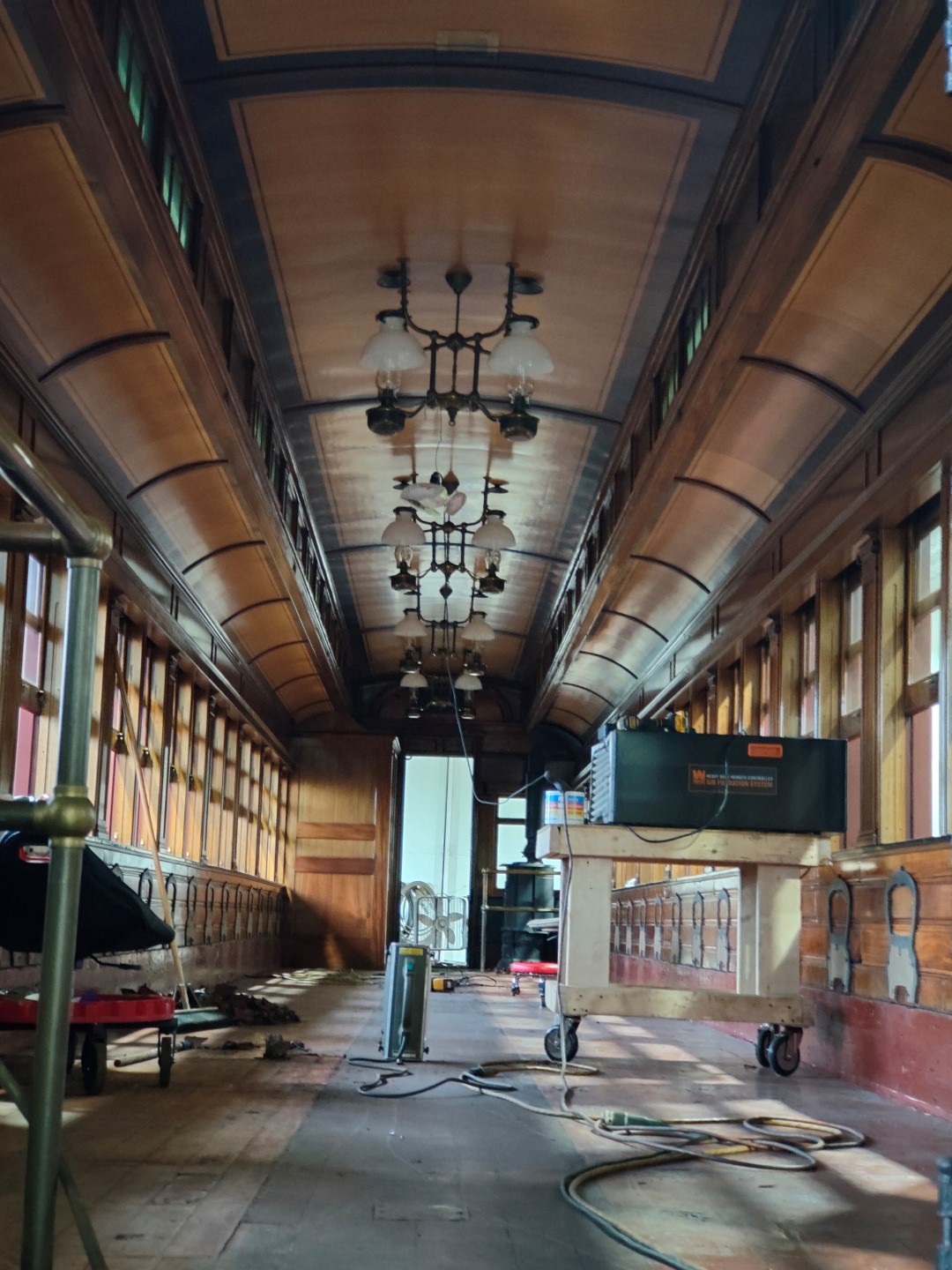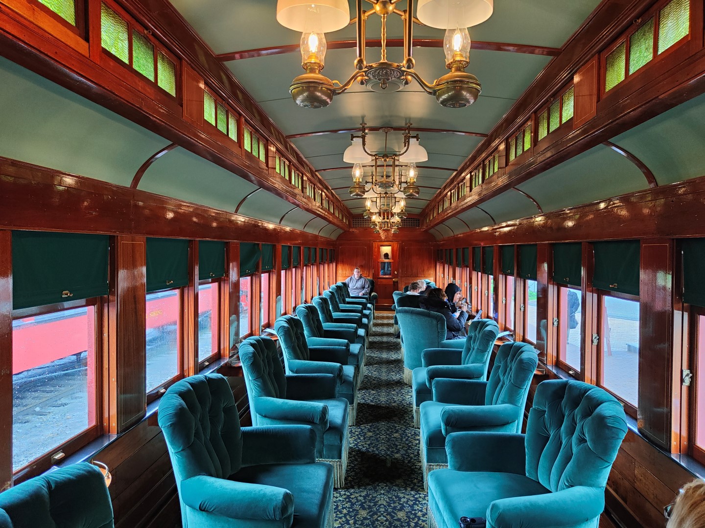 Und dann hieß es „Alles einsteigen“ – und schon nahmen wir im perfekt restaurierten Erste Klasse Waggon „Linn W. Moedinger No. 118“ in unseren drehbaren Veloursesseln Platz und warteten auf die Abfahrt.