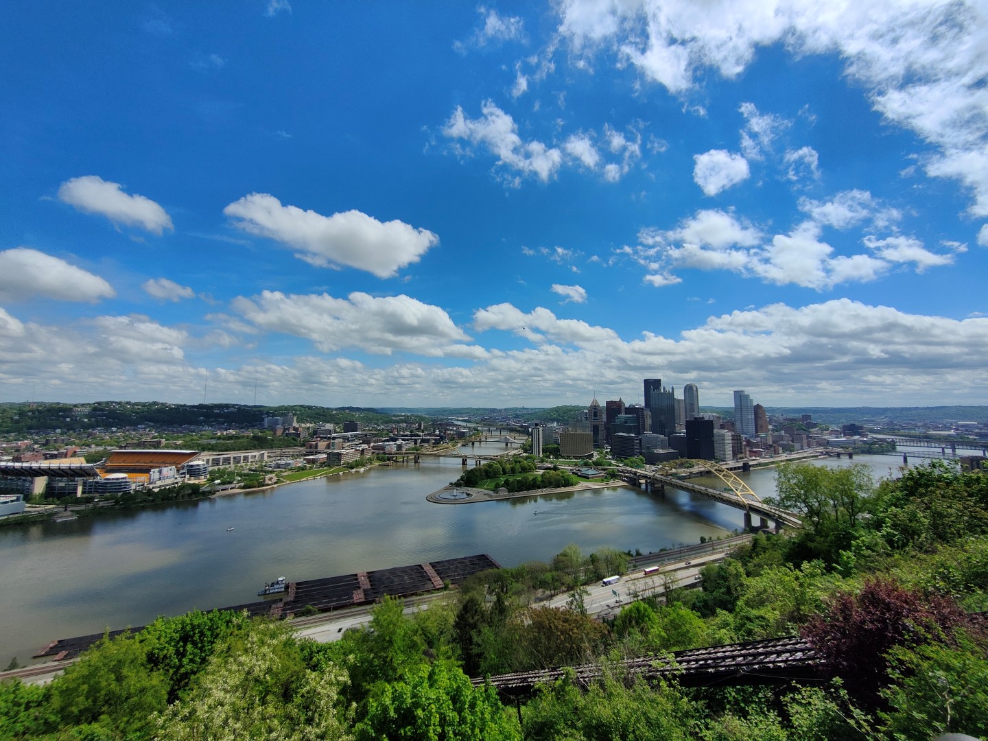 Von der oberen Plattform der Incline hat man eine wirklich tolle Aussicht auf die Stadt Pittsburgh, denn genau auf dieser Höhe treffen der Allegheny River und der Monongahela River aufeinander und vereinen sich zum Ohio River.