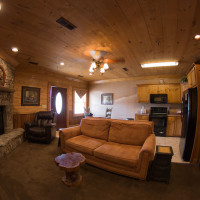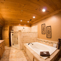 Als wir dann etwa gegen 17:30 Uhr in Blue Ridge ankamen, wurden wir an der Tür zum Office des „Serenity in the Mountains“ von einer freundlichen Mitarbeiterin bereits erwartet. Diese teilte uns unsere Zimmernummer mit und wir machten uns dann auf den Weg ums Gebäude zu unserer Suite. Wir wussten noch, dass wir bei der Buchung tatsächlich sehr angetan waren, aber als wir dann die Tür öffneten waren wir tatsächlich (und das folgende Wort ist eine absolute Untertreibung!) „überwältigt“: Unsere Suite ist größer als unsere Wohnung in Köln und absolut traumhaft eingerichtet mit großem Kamin, riesigem Flat-TV, Holzwänden, Mega-Küche, einem gigantischen Schlafzimmer und einem Wellness-Badezimmer mit Natursteindusche und Whirpool vom Feinsten. Dazu dann noch Waschmaschine und Trockner, die man natürlich kostenlos benutzen darf.