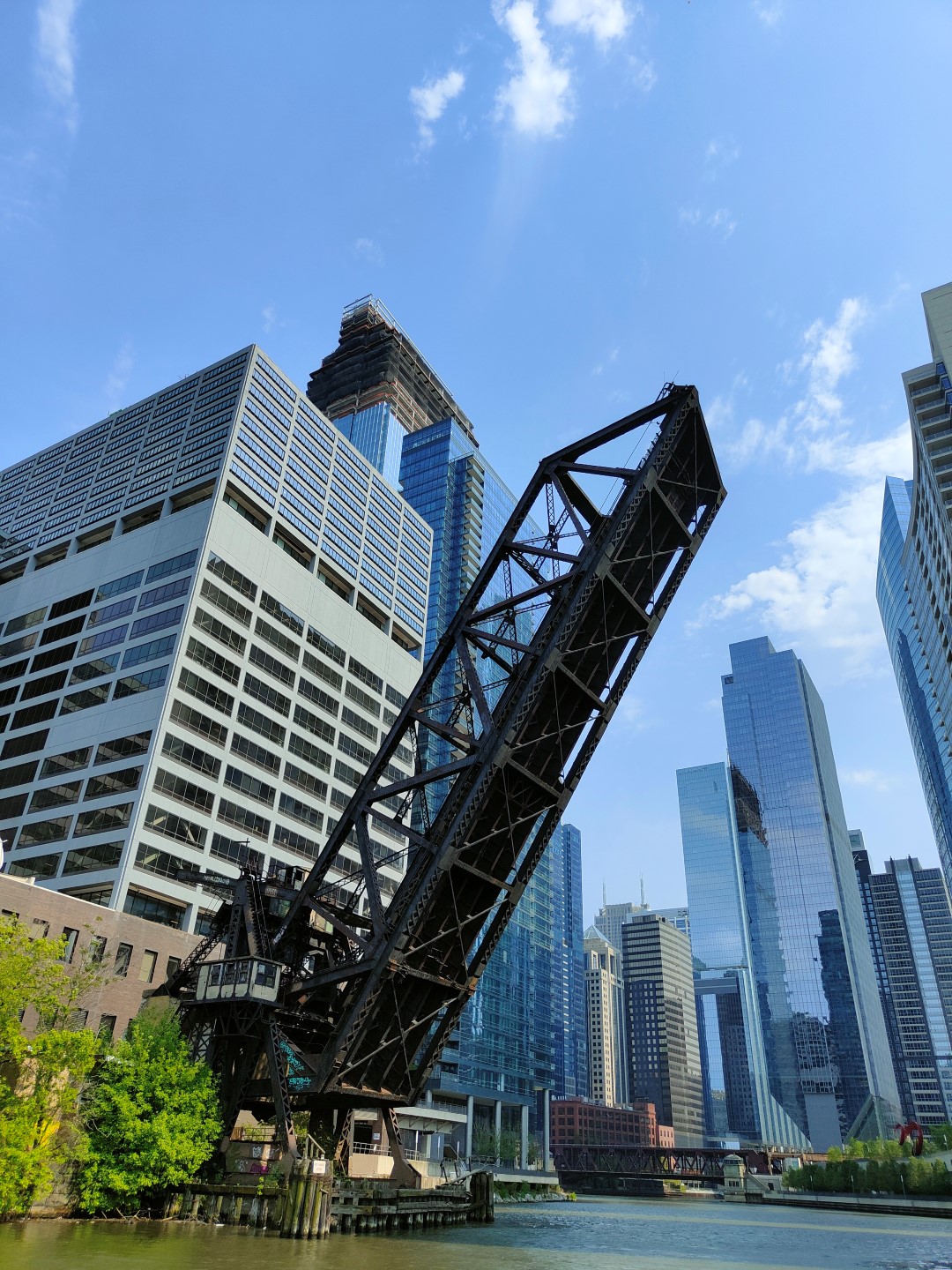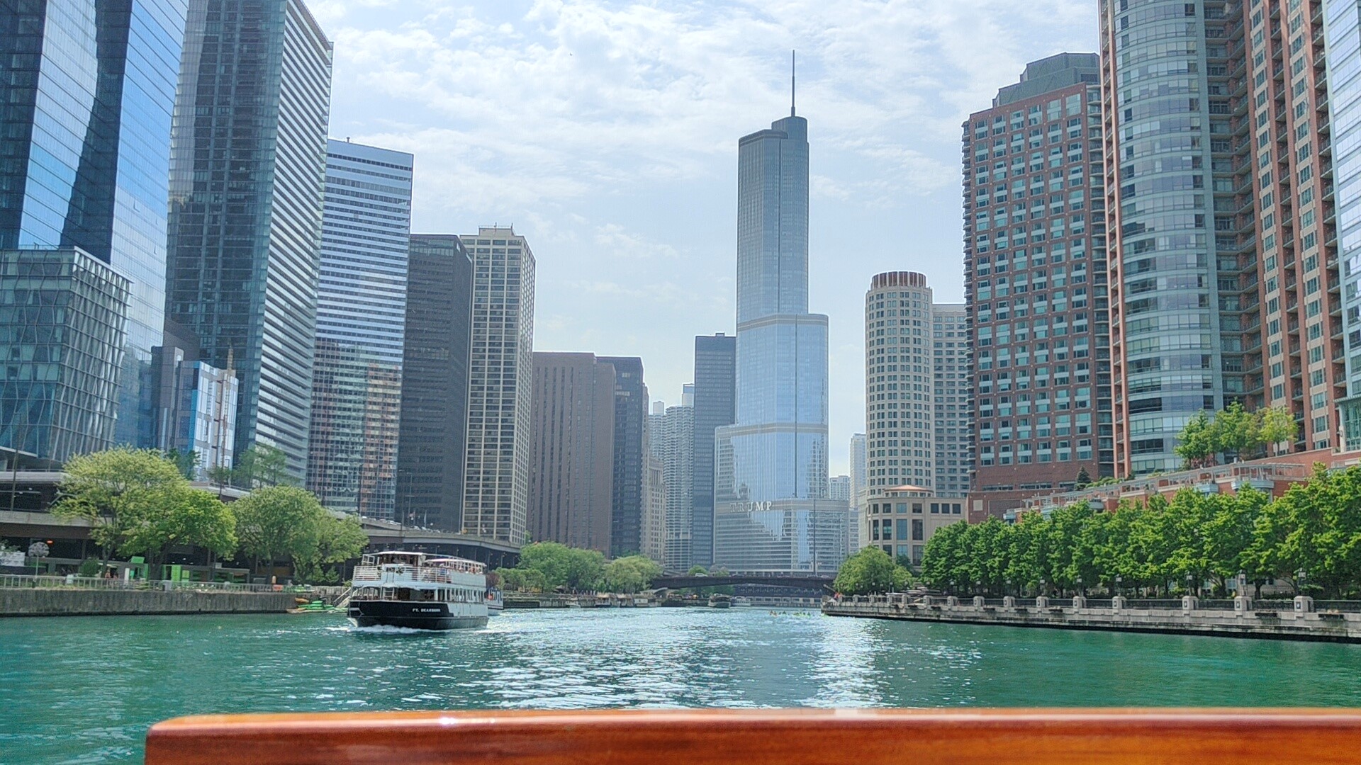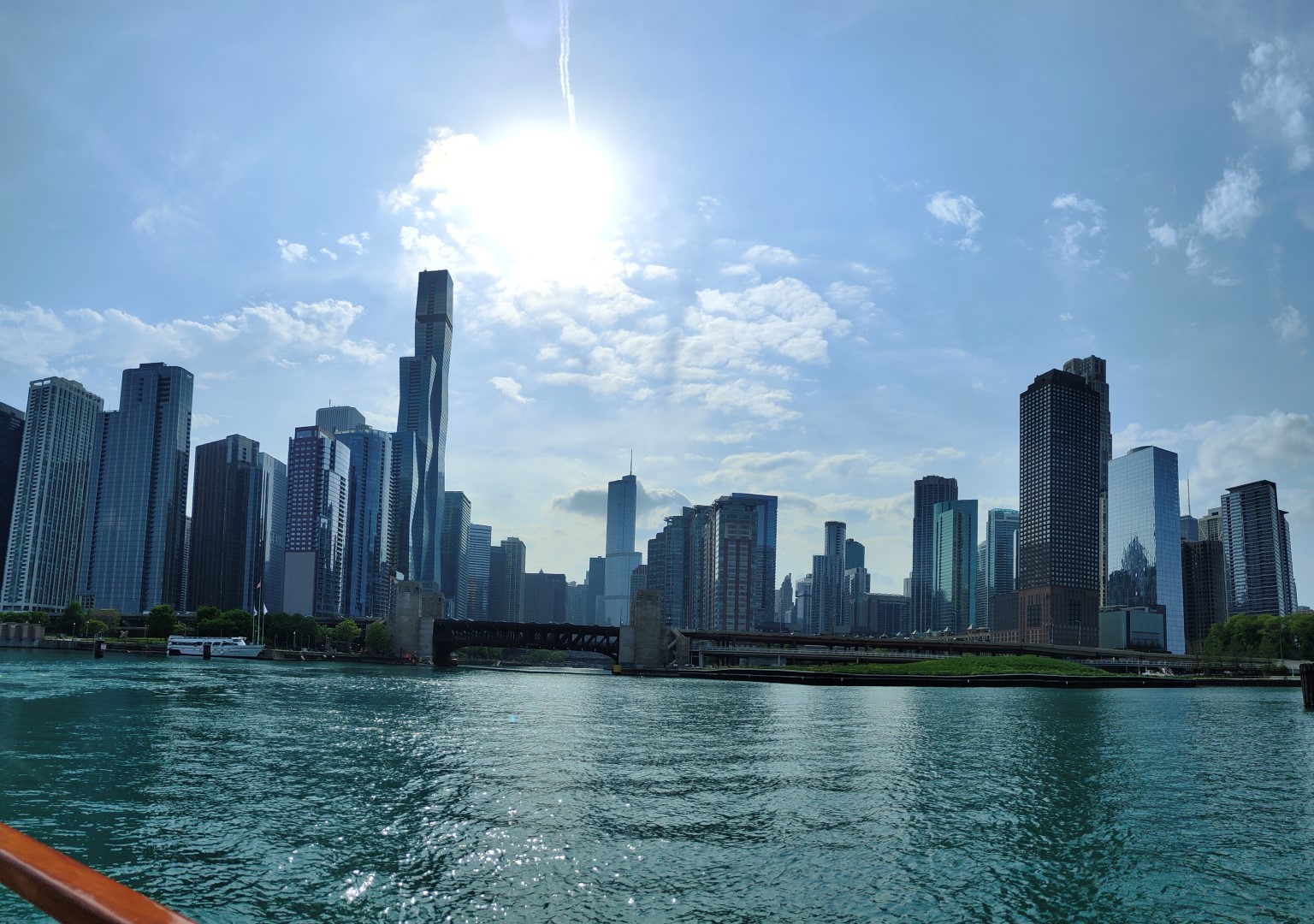 Am Pier angekommen, kamen wir genau rechtzeitig für eine Architektur-Rundfahrt auf dem Chicago River. An Bord angekommen, sicherten wir uns natürlich die allerbesten Plätze ganz vorne und wenig später begrüßte uns unser Tourguide Sam, der uns die folgenden 75 Minuten sehr unterhaltsam durch die architektonischen Feinheiten der einzelnen Wolkenkratzer führte. Tatsächlich machte er seine Sache unglaublich gut und es war sehr spannend, quasi im Vorbeischippern zu erfahren, warum die Gebäude so aussehen wie sie es tun.