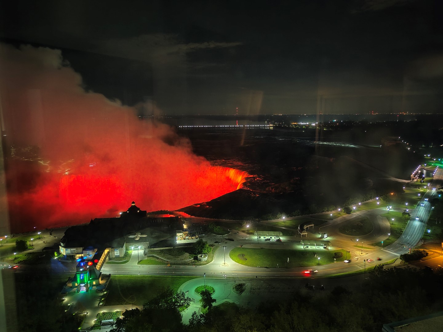 Die Fahrt von Toronto bis Niagara Falls dauerte ungefähr zwei Stunden – Dank glücklicherweise „nur“ zähfließendem Verkehr. Vor Ort angekommen war es dann noch eine ziemliche Herausforderung, unser Auto möglichst kostengünstig für die Nacht los zu werden- die Parkgebühren hier variieren von 15 kanadischen Dollar bis zu atemraubenden 80 Dollar. Da heute Samstag ist und zusätzlich auch noch Memorial Day – Wochenende, waren wir mit 40 Dollar dabei. Fast ein Schnapper! 🙂